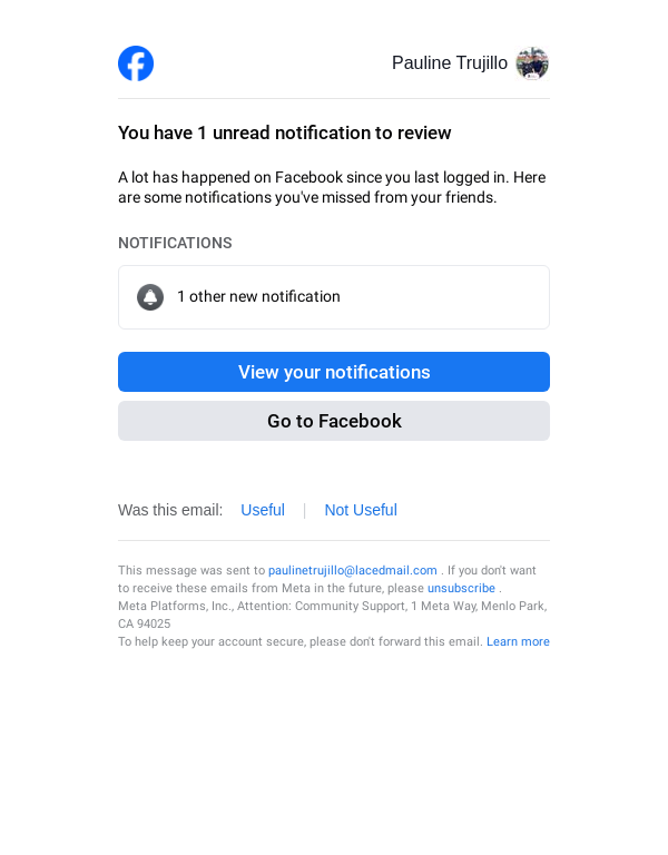 To: paulinetrujillo@lacedmail.com From: reminders@facebookmail.com Received: 2025-12-02 14:19:09.799862