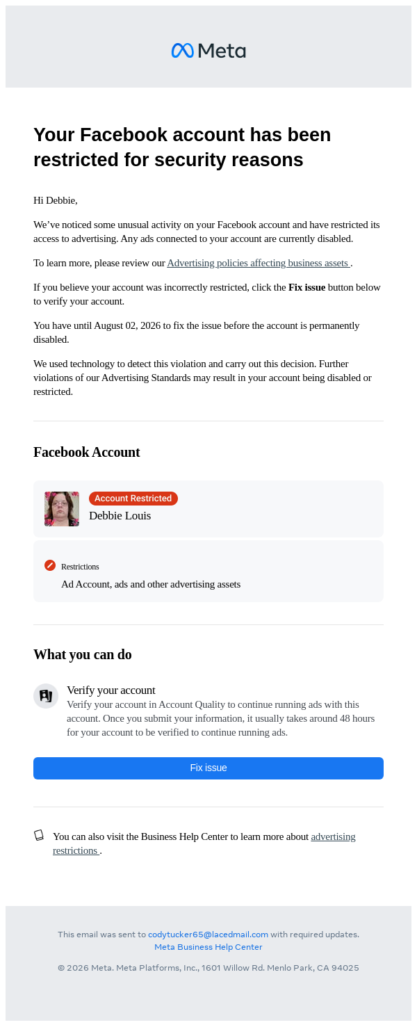 To: codytucker65@lacedmail.com From: advertise-noreply@support.facebook.com Received: 2026-02-03 18:16:01.653093