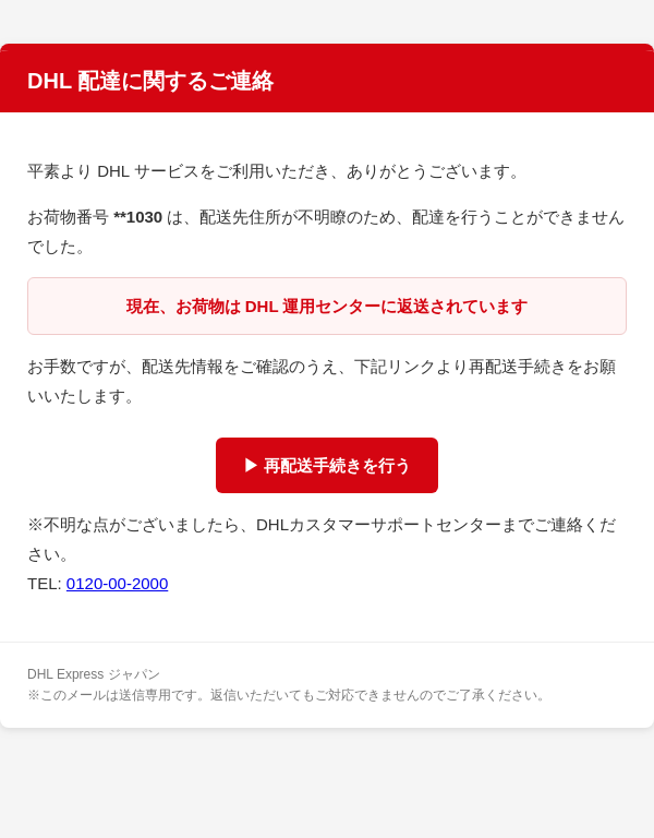 【DHL】配送先情報不備のため、再配送手続きをお願いします