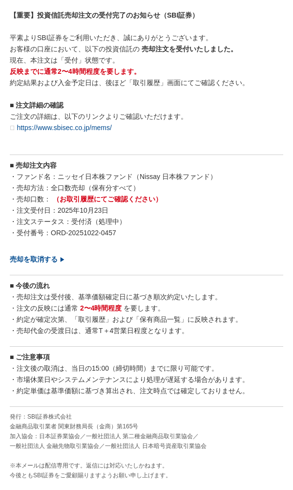 【重要】投資信託売却注文の受付完了のお知らせ(SBI証券)