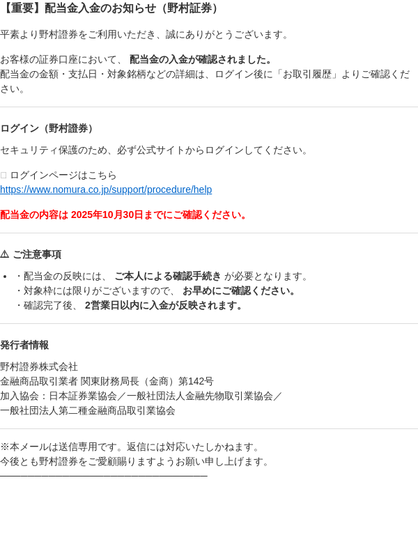 【重要】配当金入金のお知らせ(野村証券)