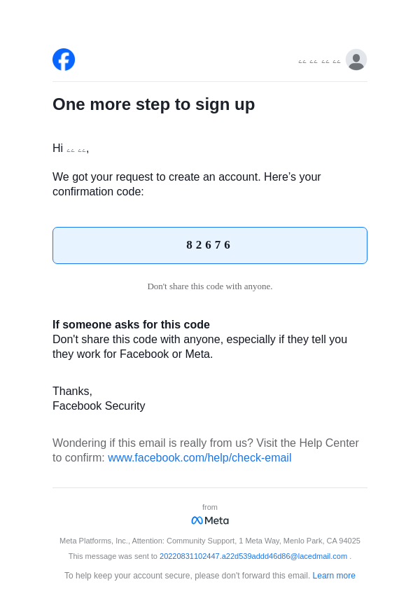 To: 20220831102447.a22d539addd46d86@lacedmail.com From: registration@facebookmail.com Received: 2025-11-13 11:21:53.043625