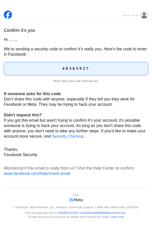 To: 20220831102447.a22d539addd46d86@lacedmail.com From: security@facebookmail.com Received: 2025-11-13 12:10:35.073273