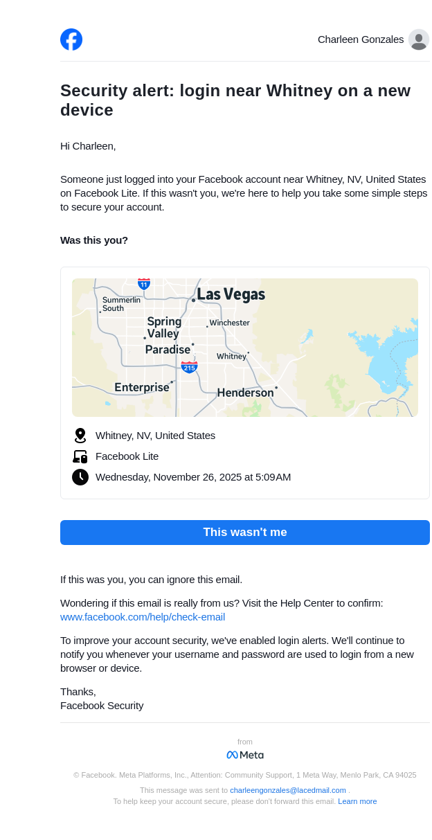 To: charleengonzales@lacedmail.com From: security@facebookmail.com Received: 2025-11-26 05:09:30.057296