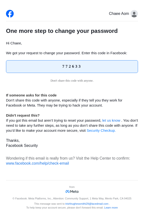 To: trishhughessmithi29@lacedmail.com From: security@facebookmail.com Received: 2025-11-26 16:52:50.912339