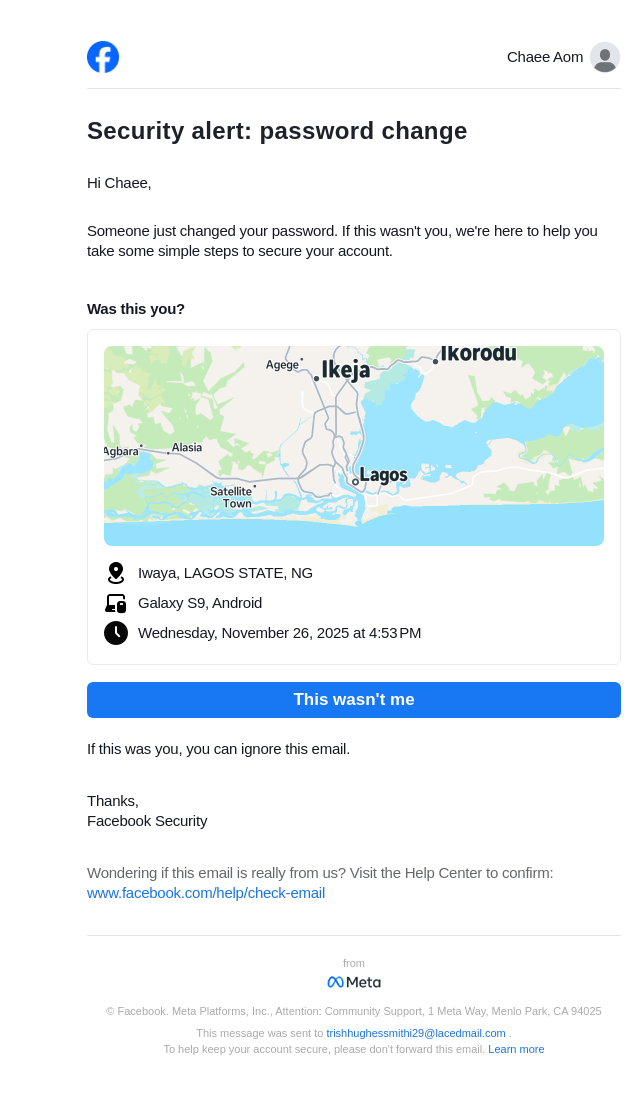 To: trishhughessmithi29@lacedmail.com From: security@facebookmail.com Received: 2025-11-26 16:53:30.242139