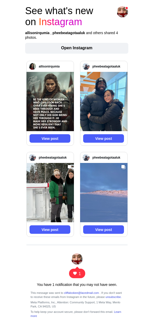 To: cliffalookee@lacedmail.com From: posts-recap@mail.instagram.com Received: 2026-01-13 20:11:58.295276