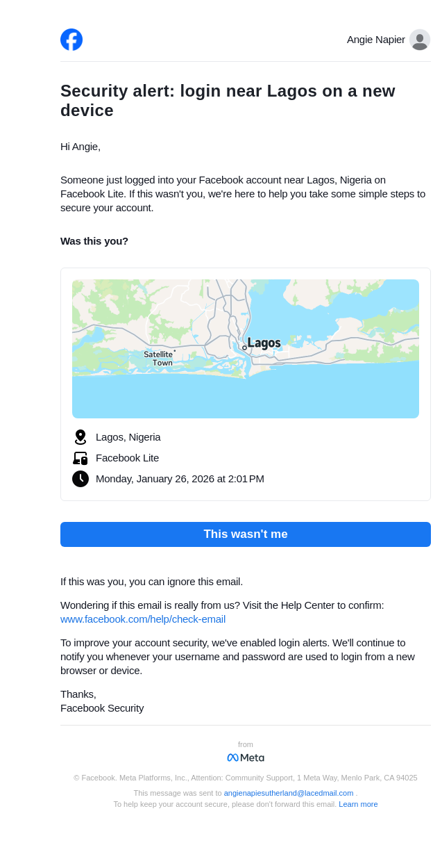 To: angienapiesutherland@lacedmail.com From: security@facebookmail.com Received: 2026-01-26 14:02:11.297451
