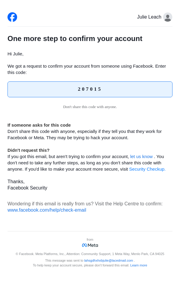 To: lahsgdhxhxbjulie@lacedmail.com From: security@facebookmail.com Received: 2026-01-28 17:31:42.041742