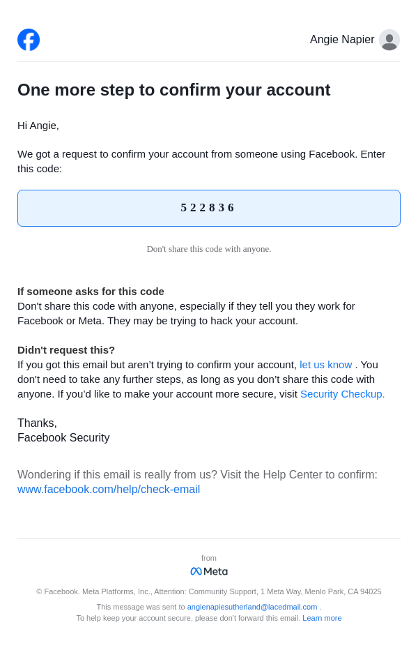 To: angienapiesutherland@lacedmail.com From: security@facebookmail.com Received: 2026-01-29 10:58:51.017880