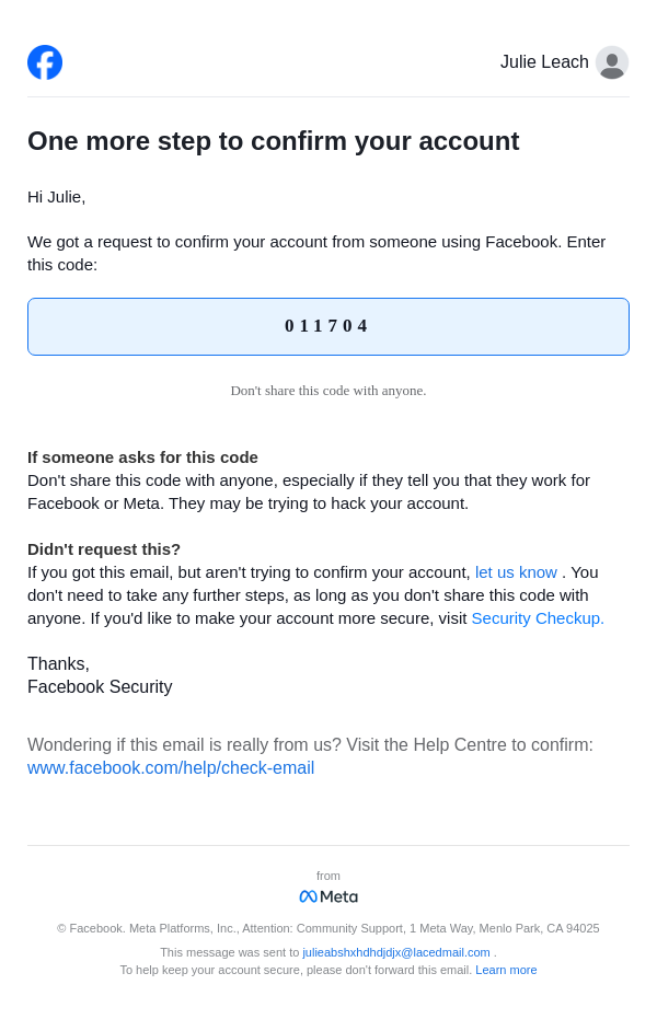 To: julieabshxhdhdjdjx@lacedmail.com From: security@facebookmail.com Received: 2026-01-30 16:42:54.394416