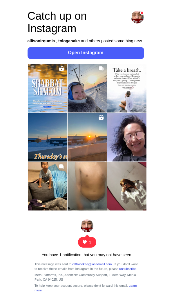To: cliffalookee@lacedmail.com From: posts-recaps@mail.instagram.com Received: 2026-01-31 05:51:07.213350