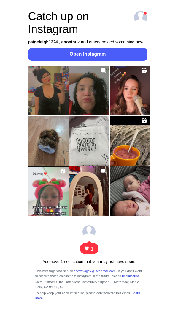 To: codyevagek@lacedmail.com From: posts-recaps@mail.instagram.com Received: 2026-02-02 11:44:45.004953