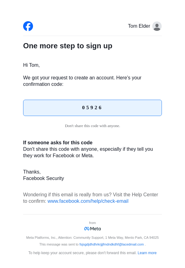 To: fsjsgdjdhdhrkrjjjfmdndkdhf@lacedmail.com From: registration@facebookmail.com Received: 2026-02-10 21:11:03.436222