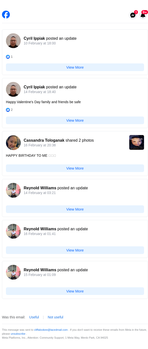To: cliffalookee@lacedmail.com From: notification@facebookmail.com Received: 2026-02-16 21:53:05.186707