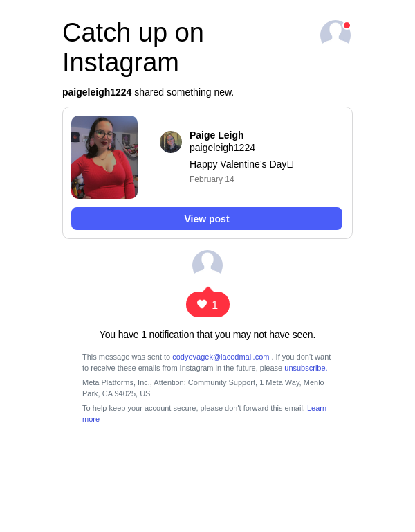 To: codyevagek@lacedmail.com From: posts-recap@mail.instagram.com Received: 2026-02-17 13:32:03.799436