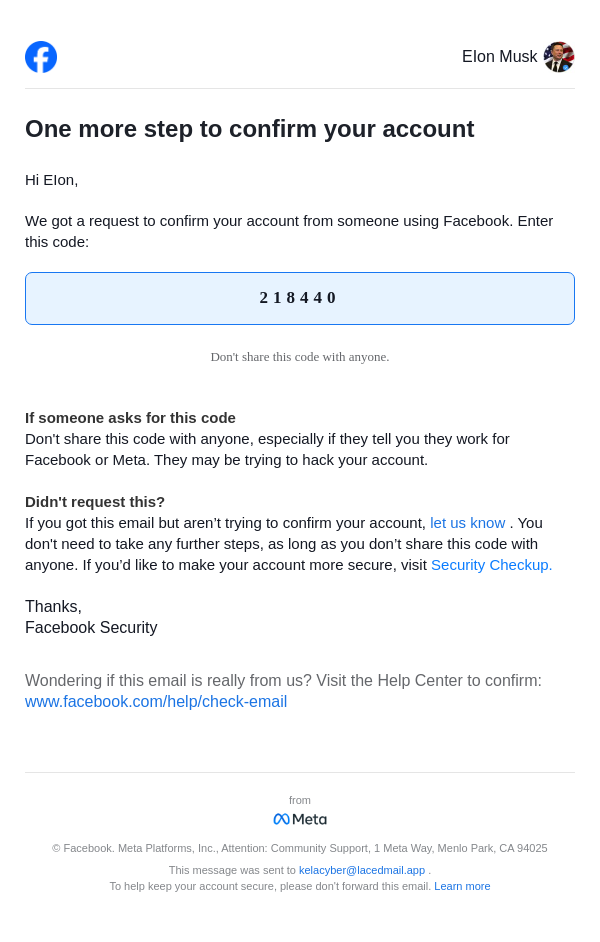 From: security@facebookmail.com