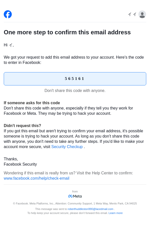To: roberthuddleston990@lacedmail.com From: security@facebookmail.com Received: 2026-02-26 12:49:39.882858