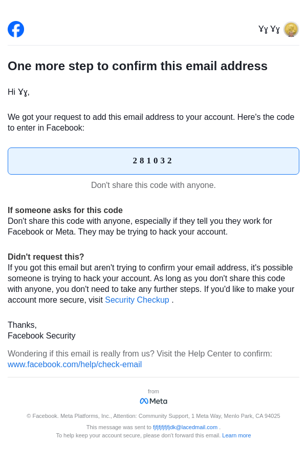 To: fjfjfjfjfjfjdk@lacedmail.com From: security@facebookmail.com Received: 2026-03-06 17:10:02.788273