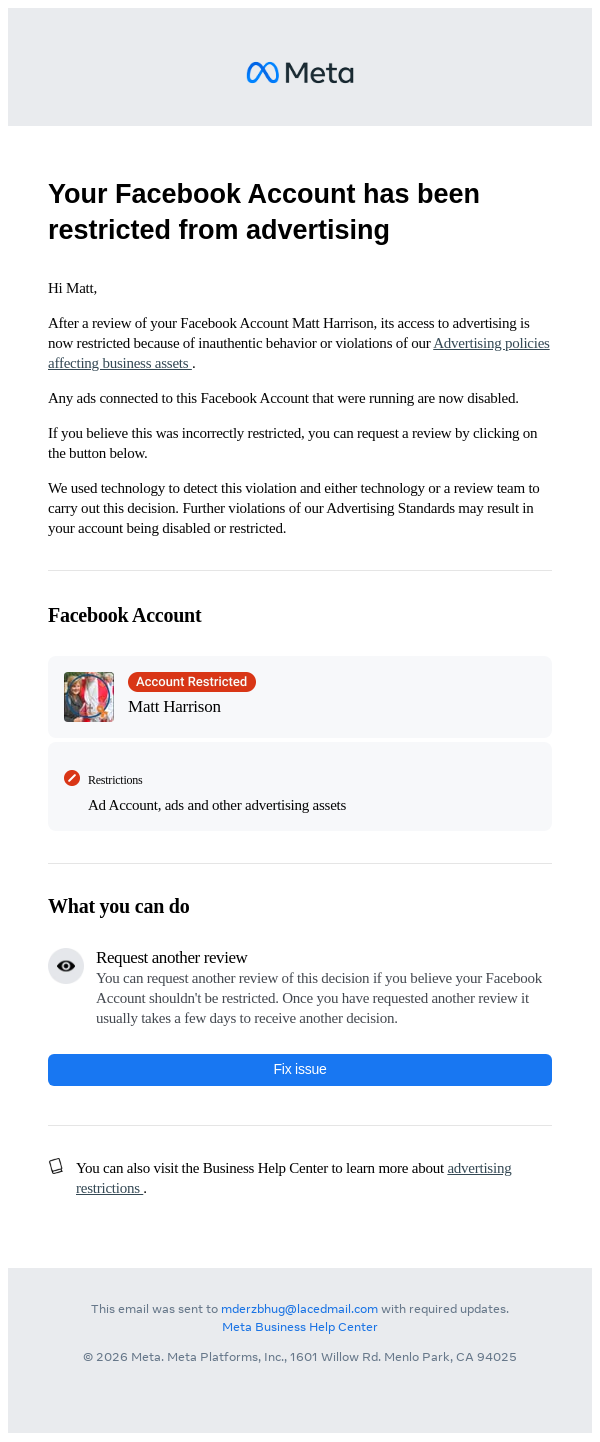Your Facebook Account has been restricted from advertising