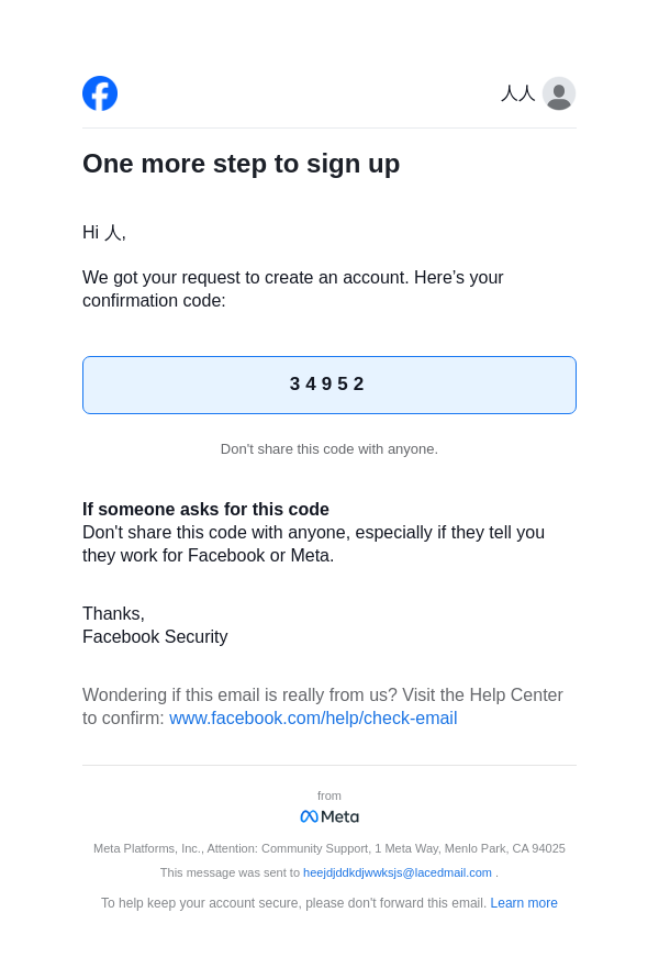 To: heejdjddkdjwwksjs@lacedmail.com From: registration@facebookmail.com Received: 2026-03-14 22:02:28.913215
