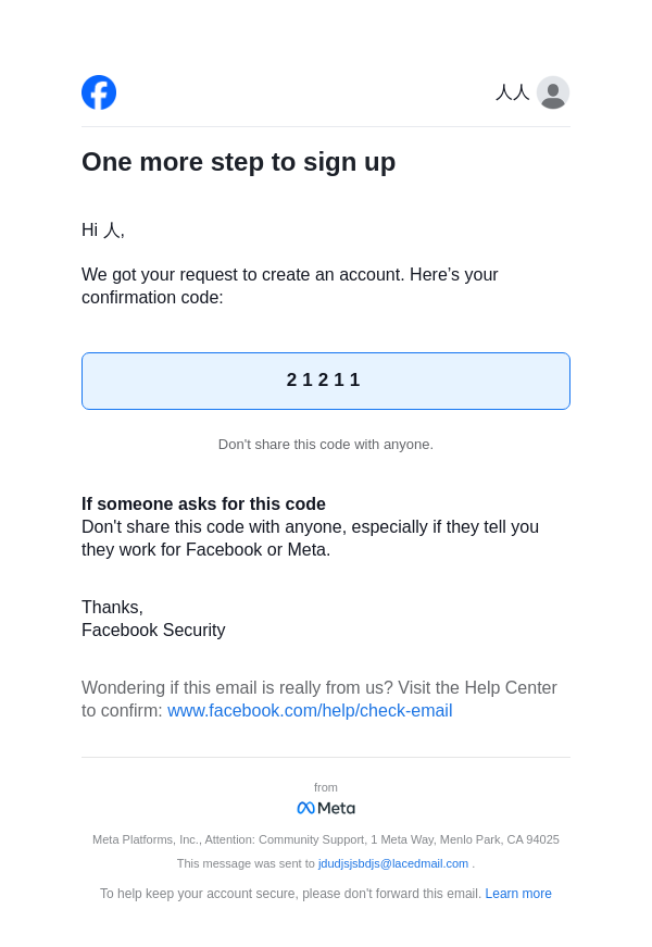 To: jdudjsjsbdjs@lacedmail.com From: registration@facebookmail.com Received: 2026-03-14 22:29:02.375204