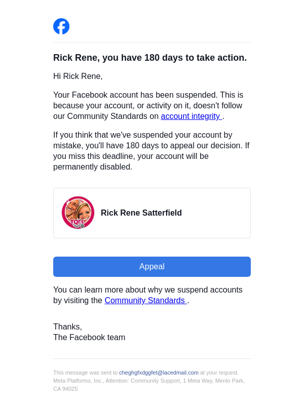 To: cheghgfxdggfet@lacedmail.com From: security@facebookmail.com Received: 2026-03-21 14:25:34.181304