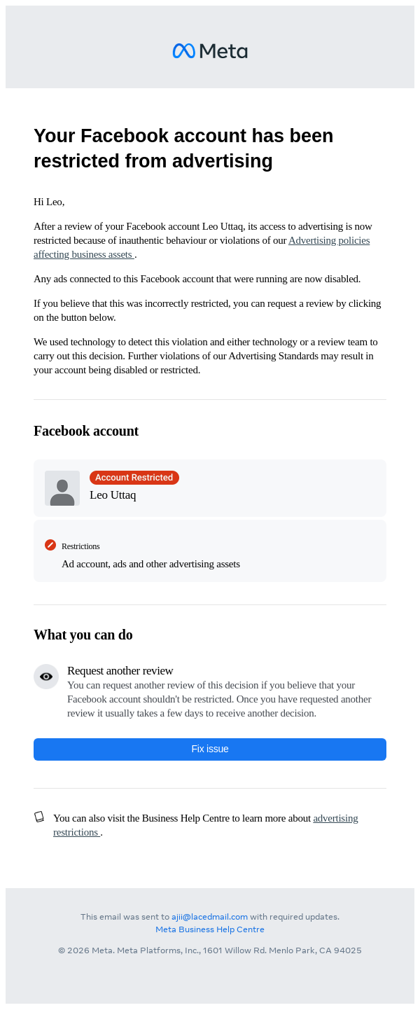 Your Facebook account has been restricted from advertising