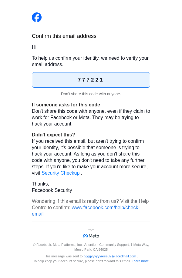 To: ggggyyyyyyreee32@lacedmail.com From: security@facebookmail.com Received: 2026-03-28 18:42:02.093783