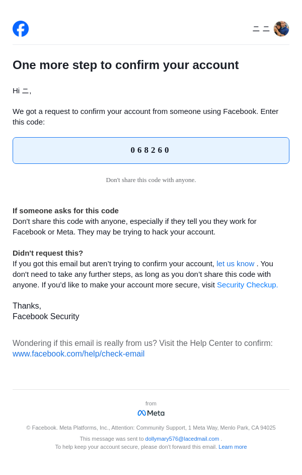 From: security@facebookmail.com