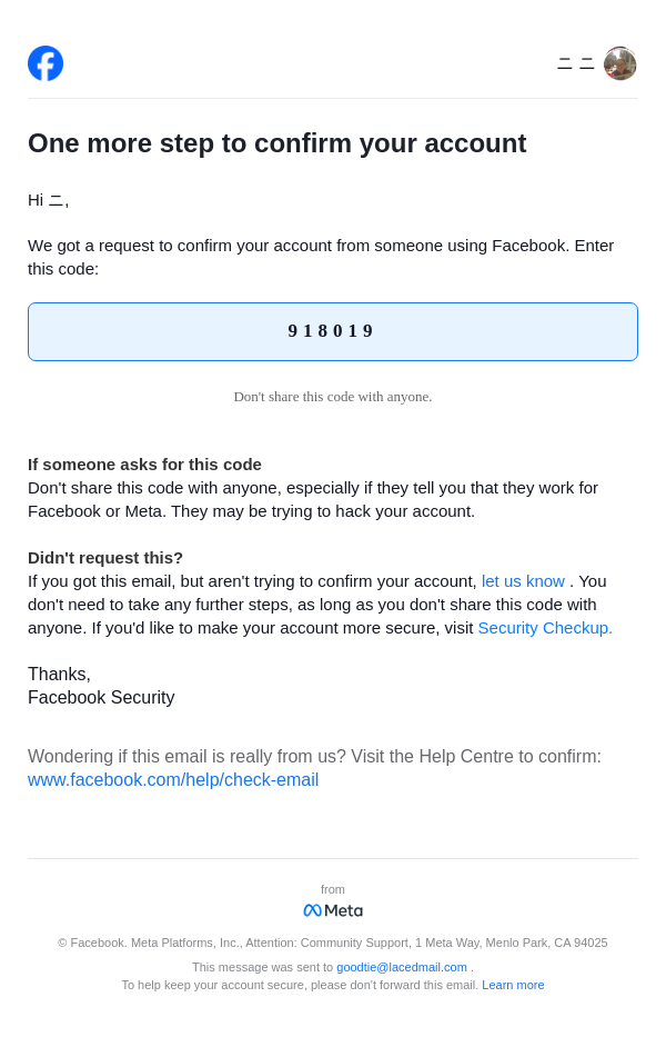 From: security@facebookmail.com