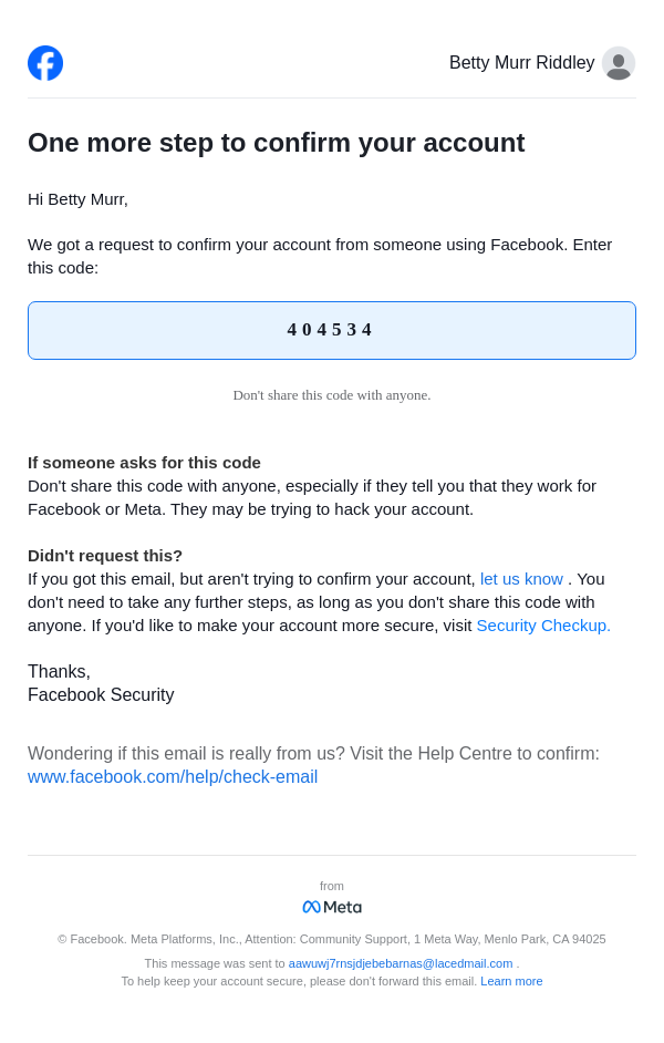 To: aawuwj7rnsjdjebebarnas@lacedmail.com From: security@facebookmail.com Received: 2026-04-05 01:54:51.937975