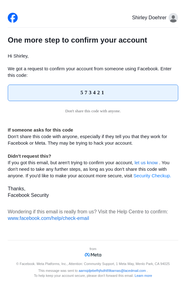To: aarnsjdjebefhjfsdh89barnas@lacedmail.com From: security@facebookmail.com Received: 2026-04-11 21:47:36.398392