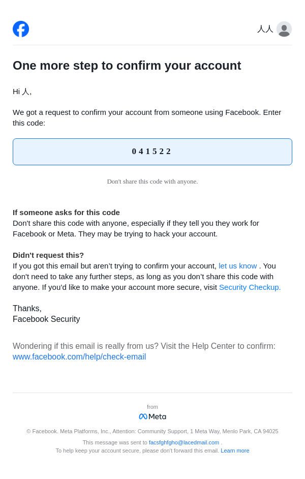 From: security@facebookmail.com