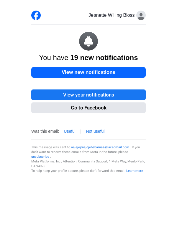 To: aajejejrnsjdjebebarnas@lacedmail.com From: reminders@facebookmail.com Received: 2026-04-17 02:40:43.654175