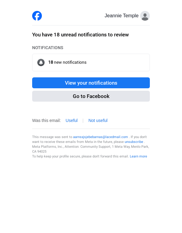 To: aarnsxjsjebebarnas@lacedmail.com From: reminders@facebookmail.com Received: 2026-04-19 18:02:55.493508
