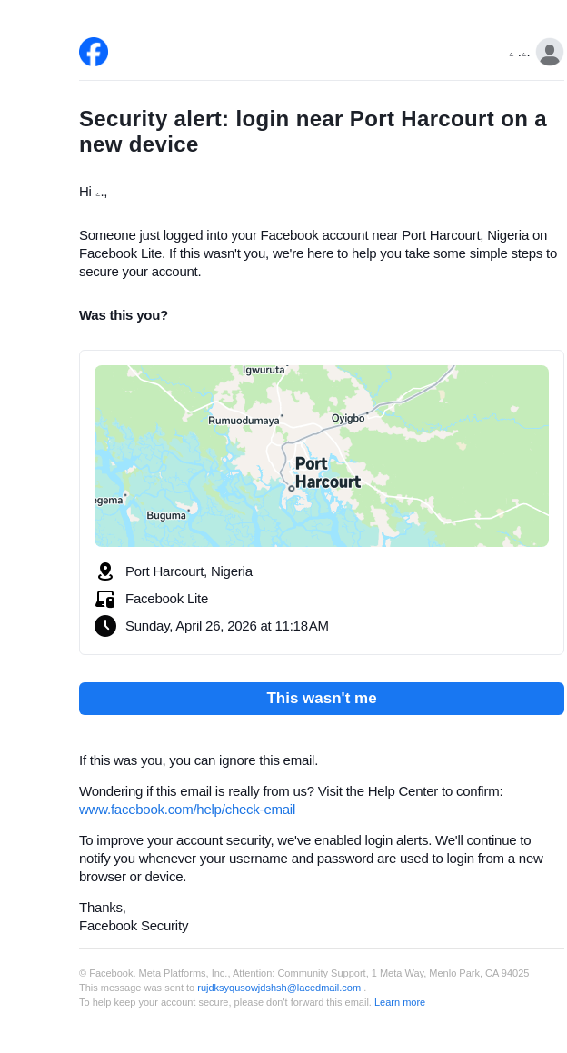 To: rujdksyqusowjdshsh@lacedmail.com From: security@facebookmail.com Received: 2026-04-26 11:18:28.392231