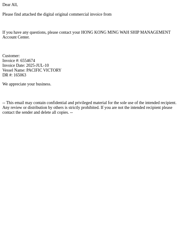 HONG KONG MING WAH SHIP MANAGEMENT / PACIFIC VICTORY / INV#-6554674 / PO #-SPVY25SC001-P01 / DR #-2106-16