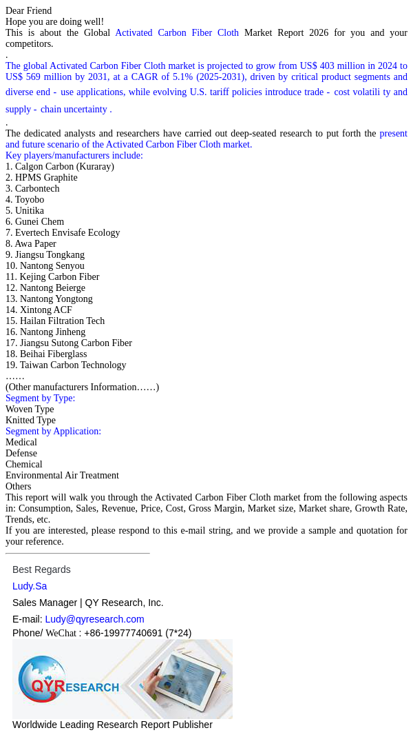 Worldwide Activated Carbon Fiber Cloth Market Research Report 2026 活性碳纤维布