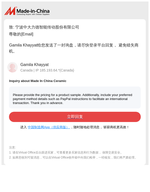 您收到了Gamila Khayyat发送的询盘消息,请及时处理