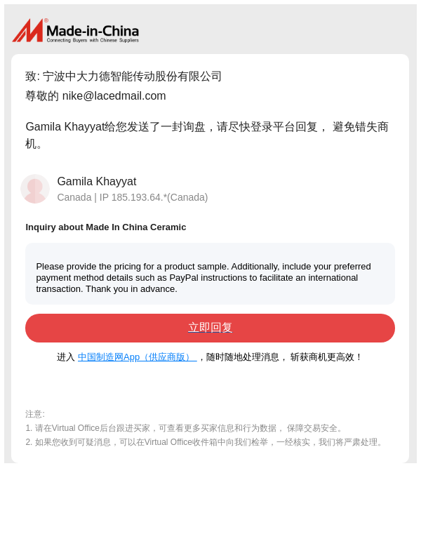 您收到了Gamila Khayyat发送的询盘消息,请及时处理