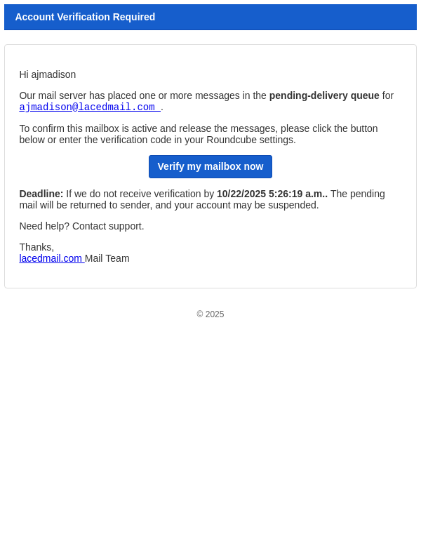 Account verification required for ajmadison@lacedmail.com