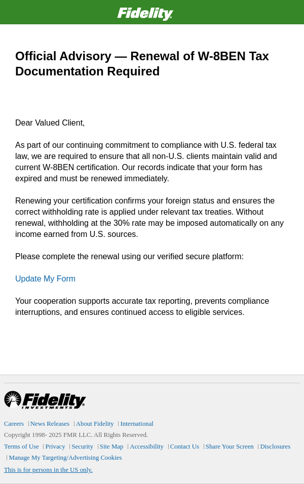 Official Advisory — Renewal of W-8BEN Tax Documentation Required