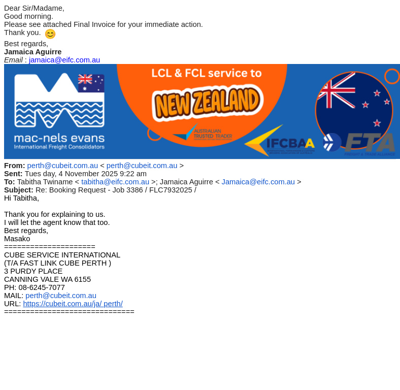 Re: Booking Request - Job 3386 / FLC7932025 /