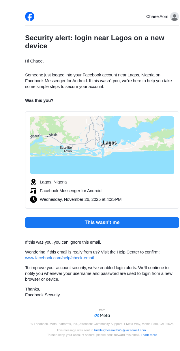To: trishhughessmithi29@lacedmail.com From: security@facebookmail.com Received: 2025-11-26 16:25:23.084034
