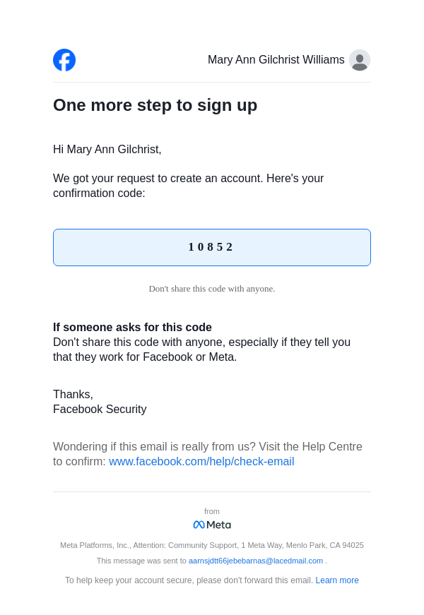 To: aarnsjdtt66jebebarnas@lacedmail.com From: registration@facebookmail.com Received: 2025-12-18 05:36:35.081073