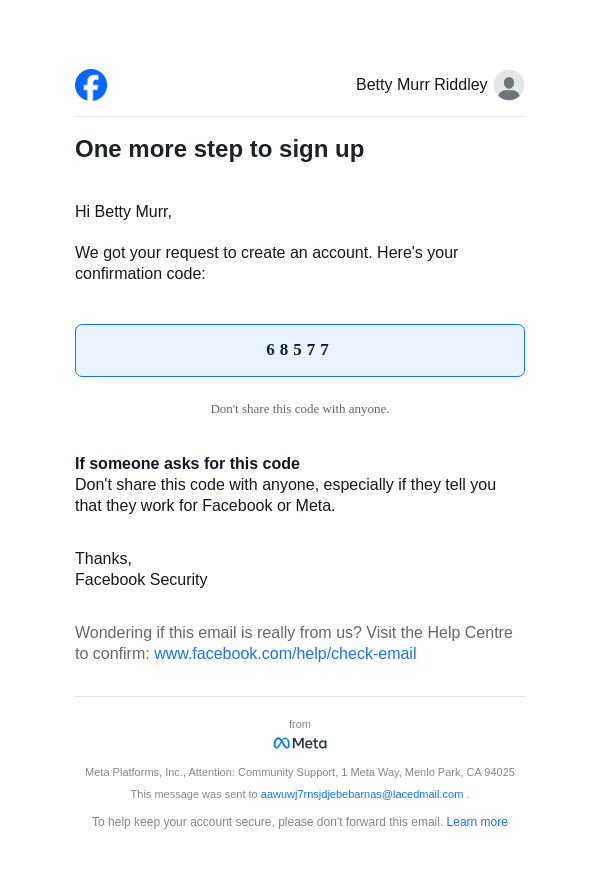 To: aawuwj7rnsjdjebebarnas@lacedmail.com From: registration@facebookmail.com Received: 2025-12-18 05:41:01.724662