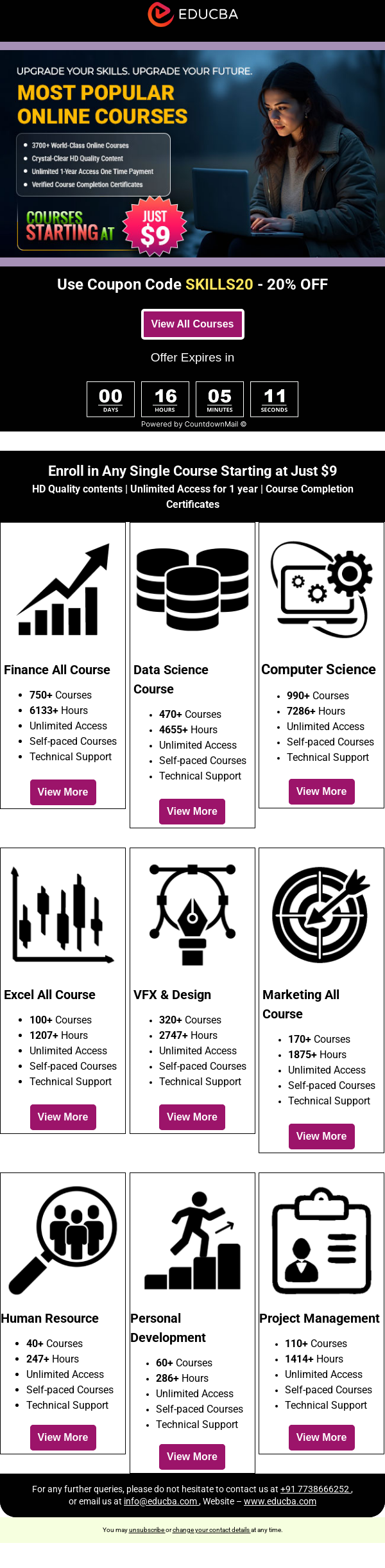 Limited Time Offer 🚀 Flat 20% OFF on EDUCBA Courses Starting at Just $9 - Enroll Now