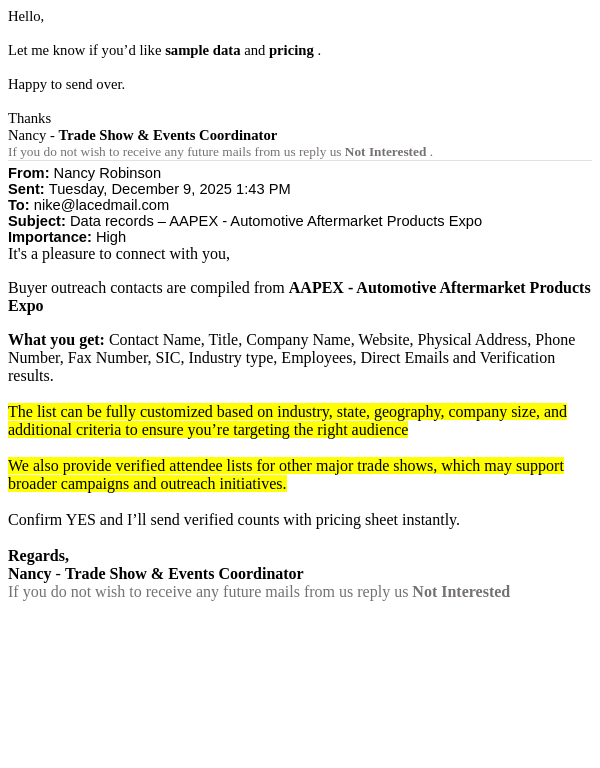 To: nike@lacedmail.com From: nancy.connectleadretrieval@outlook.com Received: 2026-01-13 17:14:03.561807