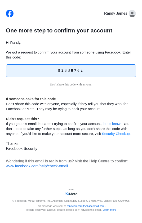 To: randyjamesmith@lacedmail.com From: security@facebookmail.com Received: 2026-01-19 23:32:18.804537